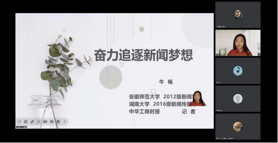 19点30整,报告会正式开始。作为中华工商时报的记者,牛畅从自身的实践经历出发就校园学习和媒体工作两个方面进行了经验分享。在学习方面,牛畅提到了三点:一是要珍惜学习的机会,珍惜身边的良师益友,二是要珍惜时间和精力,在有限的时间里充实自我,三是要投身实践,勇敢走出校园。牛畅认为扎实的本科学习将为今后升学或就业打下良好基础,因此建议同学们在校园内拓展阅读面,有意识地培养和积累学术能力,给自己创造未来发展的可能性。仅仅依靠书本中的知识仍是不够的,牛畅还鼓励同学们多培养自身的开拓精神,敢于尝试,于实践中感悟和成长。在工作方面,牛畅分享了自己从事媒体工作的经历,并介绍了她现在所在的工作单位即中华工商时报的一些基本情况。她还特别提到了作为一名党员,非常荣幸能够参与党的二十大的报道,同时分享了一些采访经历,表示新闻工作者要用情用力投入工作,时刻牢记责任在先。