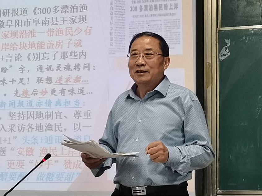 手握一只蓝色保温杯,刘杰一脸和蔼得用略带口音的语言为21级新闻学子开启了如何写好头条新闻的续章:“敢冒风险需看远一步”。2023年4月10日晚7点20分,我校特聘教授、人民日报安徽分社原社长、人民日报高级记者刘杰为2021级新闻学专业的学生开设采风指导讲座第二场,本场讲座依旧围绕“头版头条的写作艺术”这个主题,讲述此主题的第二章“敢冒风险需看远一步”。此次讲座由新闻学专业教师杨瑾瑜博士主持。
