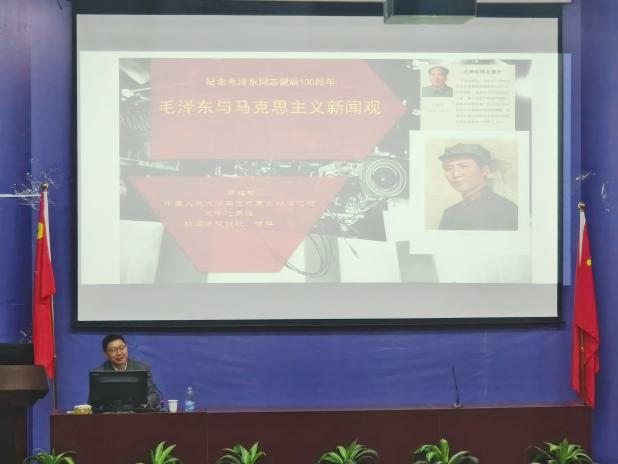 邓绍根教授以“习近平在纪念毛泽东同志诞辰120周年座谈会上的讲话”作为引言,讲述毛泽东同志在其一生的革命历程中,借助新闻舆论宣传革命的动人故事和光辉业绩。其次,邓教授着重讲述了五四时期青年毛泽东的新闻道路,他从“五四时期青年毛泽东学新闻”“青年毛泽东干新闻”和“青年毛泽东思新闻”三个阶段系统梳理了五四时期青年毛泽东的新闻道路历程,阐释了“傍着活事件来讨论”“用事实说话”等新闻思想。邓教授通过一个个鲜活的案例,生动地讲述了青年毛泽东的办报、新闻写作和其它新闻宣传活动,向大家讲解了毛泽东新闻思想的产生过程。邓绍根教授指出:“五四时期青年毛泽东学新闻、干新闻、思新闻的新闻道路为后来的党报理论积累经验,奠定思想基础,推动党各项事业的发展。”接着,邓教授为我们讲述了毛泽东党报思想和毛泽东新闻思想。最后,他勉励同学们要奋发图强:“天下没有白费的努力。成功不必在我,而功力必不唐捐。”