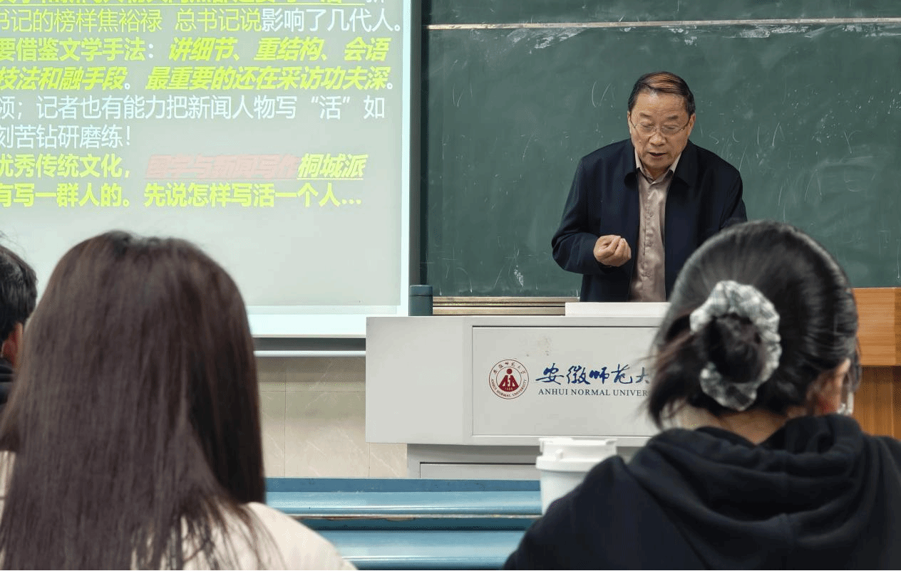 近日,我校特聘教授、人民日报安徽分社原社长、高级记者刘杰在行知楼2010201教室,为2023级新闻专业的同学们带来了一场主题为“国学与新闻学研究、怎样把人物写‘活’”的精彩讲座。此次讲座由新闻学主任张荻主持,2023级新闻学专业全体同学到场聆听学习。