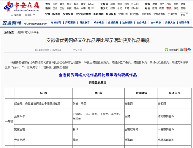 据悉此次活动是为进一步贯彻落实《文化强省建设实施纲要》,引导和鼓励我省优秀网络文化作品的创作生产,满足全省人民日益增长的精神文化需求,推动安徽省网络文化大发展大繁荣而开展的。大赛分为五大类别,即优秀网络公益广告、优秀网络音乐、优秀网络文学作品(诗歌、散文、小说、故事)、优秀网络CG作品及网络摄影作品、优秀微视频(微电影、DV、Flash短片)。评比展示分预审、网上展示、网民投票、专家评审相结合的方式,评审时间历时近两个月,获奖作品将向全国重点新闻网站和主要商业网站推介。
