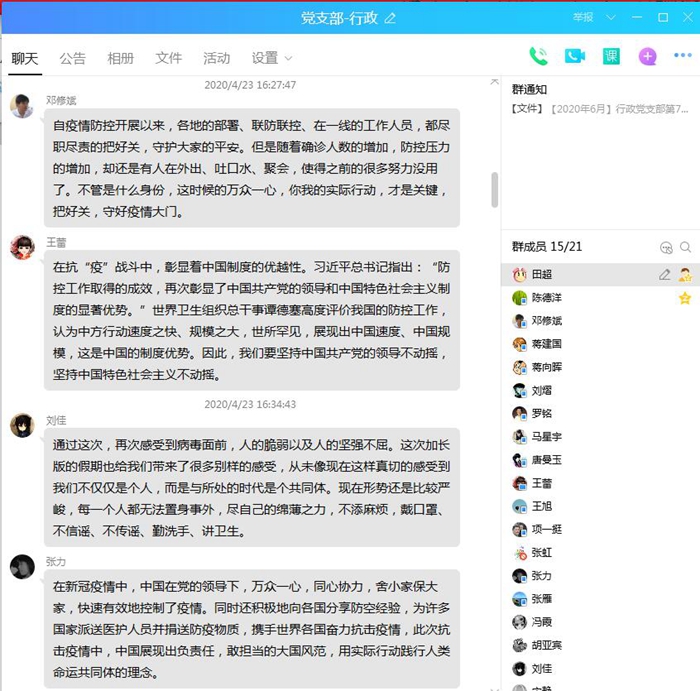 在疫情防控的形势之下,《全国大学生同上一堂疫情防控思政大课》《战“疫”思政大课(安徽专场》的在线直播,为基层党建提供生动详实的学习材料。行政党支部的党员活动日根据在线学习内容,展开了深入的线上交流与讨论。围绕战“疫”思政课,大家表示疫情面前,一城一国皆是小我,只有打破国别、种族的界限,放下暂时的矛盾、争议,才能充分调配所有的时间精力和资源打赢这场疫情阻击战。围绕两会开幕和政府工作报告,大家表示尽管这场前所未有的新冠疫情严重冲击了国家的经济与民生,但始终坚信党和政府坚强有力的领导必定能全面化解这场重大危机。学而思、思而言的线上学习方式充分调动每位党员的学习积极性,潜移默化中感染了自身的精神风貌和责任担当。