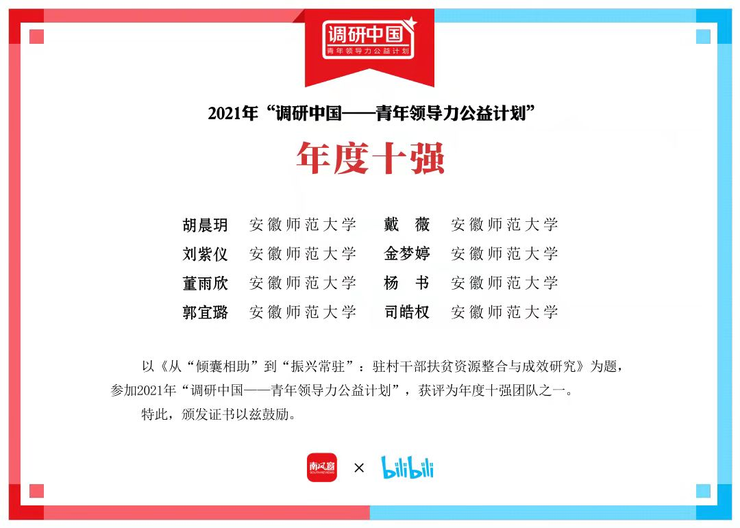 本网讯(文/胡晨玥 图/赴岳西乡村振兴与脱贫攻坚主题采访团)11月18日,“2021年南风窗·调研中国——青年领导力公益计划”结果揭晓,由学院辅导员马星宇、李梦圆老师指导的社会调研团队“赴岳西乡村振兴与脱贫攻坚主题采访团”与中国传媒大学、暨南大学、武汉大学等知名高校团队一同入选全国十强。这是我院第四年参加该项活动,第二次获得全国十强的荣誉称号。
