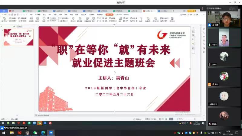 5月26日,德赢AC米兰合作伙伴召开本科生毕业班就业促进主题班会,2018级新闻(含中英)、网新、广告、摄影四个专业全体毕业生齐聚线上,班会由18级辅导员刘熠主持,院党委副书记吴青山出席会议。