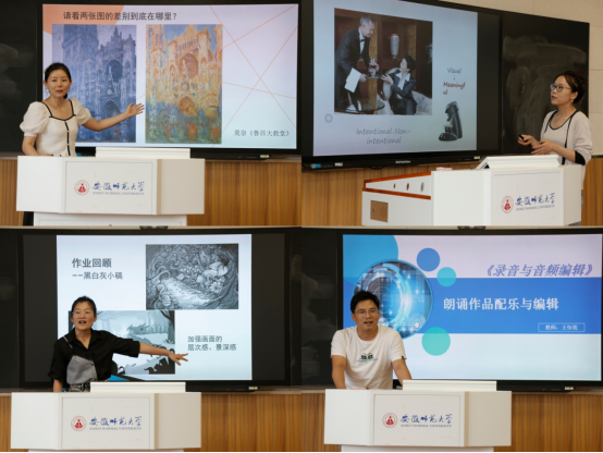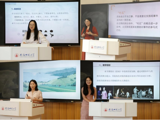比赛上,广告学专业的凤鸣老师讲授《广告设计基础》中的平面构成,从点的形态、点的位置、点的线化等各方面切入,并结合“艾宾浩斯错觉”原理阐释参照物的不同会使我们产生视觉上的错误,同时以《理想照耀中国--穿越百年,见证辉煌》这一作品为例,分析了点在实践中的运用特点和表现形式;既有案例分析,又有理论知识,全面生动地讲解了点在平面构成的原理和实际应用。播音与主持艺术专业的王恒乾老师讲授《录音与音频编辑》,从为何配乐、乐器与情绪、如何选配等各方面来讲述如何通过音乐的映衬来使朗诵更具表现力,更具感染力;并通过《老人与海》这一朗诵案例,将处理前后的多段音效对比,生动地讲解了视频处理中音乐辅助情绪表达的作用,从操作要领到可应用的层面,将教学环节层层推进,获得了较好的教学效果。新闻学专业的葛欣航老师讲授《传播学概论》,以生活中的传播学——“吃瓜”现象为例,从“吃瓜”的由来、“吃瓜”的行为动因到我们应该如何正确“吃瓜”娓娓道来,并结合相关案例将传播学知识运用到现实生活中,实现理论与实际相结合,讲课形式多样,讲解绘声绘色。影视摄影与制作专业的秦臻珍老师以全英文授课的方式讲解专业知识,讲解生动,极具特色。动画专业的陈若飞老师和卢晓红老师分别从色彩的强调与点缀和场景的功能入手,讲述全面,内容充实。