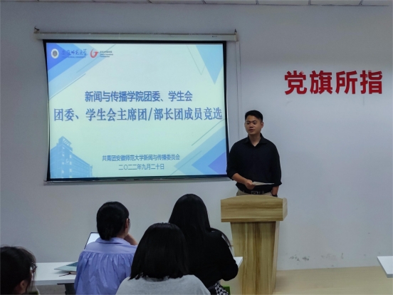 竞选会伊始,竞选主席团成员姚巧巧、王涵、鲍孟佳和竞选团委副书记成员周弘历、毛心如依次上台发言汇报,就团委及学生会任职两年情况进行总结、回顾,就未来团委、学生会建设工作进行展望、规划,突出留任优势,诉说未来愿景。随后,各部门竞选部长的成员一一汇报。宣传部张睦笛晓之以理,拿数据说话——累计完成推文制作及稿件撰写数量彰显竞选优势;素质拓展部房鑫悦动之以情,讲述在团委任职一年的成长;办公室王孙貊骊巧用提问式进行汇报,令人印象深刻;文艺体育部景镜维侃侃而谈、轻松幽默,带来别样氛围。