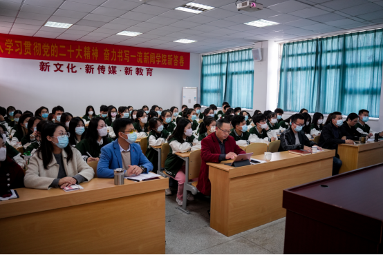 “中国是王道,西方是霸道。”“要常想2035年,你们在干什么,能够贡献什么。”“你们都是全省佼佼者,不要辜负过往的努力。”“要学好中国化时代化的马克思主义新闻观,讲好中国故事。”“要带着思考听课,带着问题听课。”“要以学为主,兼学别样,学了就是自己的,学了,就有了底气”……周书记的报告语重心长,发人深醒,始终以党的二十大报告为牵引,着力关注同学们的未来,始终启发着同学们的梦想、信心与信念,与同学们达到了高度的心灵沟通和情感共鸣。