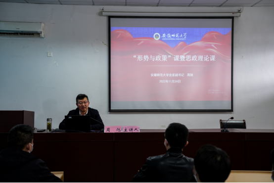 周旭从当前疫情防控形势入题,结合身边人、身边事,从五个“牢牢把握”以及党的二十大报告的其他创新点等六个方面为师生们深入宣讲了党的二十大报告,深刻解读了“如何在学习、生活和工作中学习宣传贯彻党的二十大精神”。他指出,党的二十大报告全面总结了过去五年的工作,高度概括了新时代十年走过的极不寻常、极不平凡的奋斗历程,全面回顾了党和国家事业发展取得的举世瞩目的重大成就,总结提炼了新时代十年伟大变革的里程碑意义,学习宣传贯彻党的二十大精神,必须深入学习领悟过去五年工作和新时代十年伟大变革的重大意义。