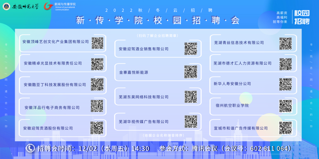学院高度重视此次招聘会,通过招聘邀请发布、用人单位报名、工作人员认真遴选后,共邀请了芜湖青丝信息技术有限公司、安徽精卓光显技术有限责任公司、安徽顶峰艺创文化产业集团有限公司、宣城市和谐广告传媒有限公司、安徽迎驾贡酒股份有限公司、宿州航空职业学院、芜湖华视传媒广告有限公司、金寨嘉悦新能源、芜湖东昊网络科技有限公司、安徽迎驾酒业销售有限公司等11家优秀企业单位,提供就业岗位共150个。