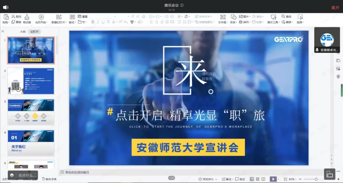 吴青山首先代表学院致辞,对参与的用人单位表示热烈的欢迎和由衷的感谢,并简要介绍学院和各专业的基本情况,期待以此次活动为契机,为用人单位输送更多高质量人才。研究生教学秘书崔霞主要介绍了研究生的毕业情况,就专业情况和生源情况两方面进行汇报,提及毕业生中安徽本地生源居多,希望其能与省内优质企业双向选择。马星宇介绍了本科毕业生的基本信息,从专业情况向各企业负责人员报告,以便企业与毕业生后续的交流。发言完毕后,学院领导老师与企业招聘负责人进行了线上的云合影。
