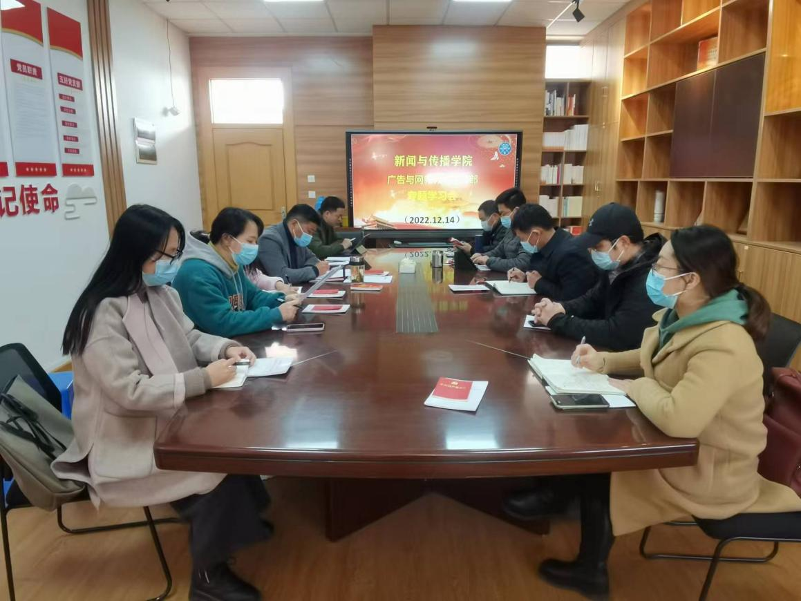 12月14日下午,广告与网新党支部在学院507室召开支部会议,结合学校“两个振兴计划”,联系教学科研、社会服务工作实际,认真开展党的二十大报告专题学习。新闻传播学院党委书记张师帅、副院长秦枫、支部党员参加了会议,会议由支部书记罗铭主持。