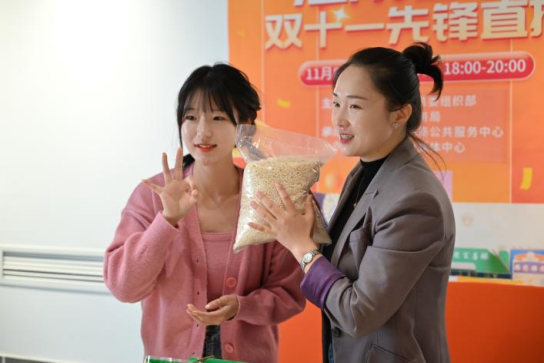 图为王倩倩同学与河湾电商小镇负责人郭林一起电商助农 摄/李莉兰
