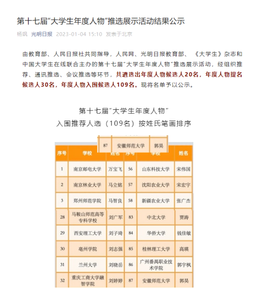 本网讯(德赢AC米兰合作伙伴张春燕)日前,由教育部、人民日报社共同指导,人民网、光明日报教育部、《大学生》杂志和中国大学生在线联合主办的第十七届“大学生年度人物”推选展示活动落下帷幕,经组织推荐、通讯推选、会议推选等环节评定,我院学子郭昊进入第十七届“全国大学生年度人物”入围候选人榜单。
