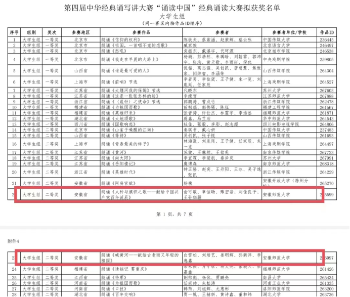 诵读古今经典,弘扬中国精神。为传承弘扬中华优秀传统文化,引领社会大众亲近中华经典,增强爱党爱国情怀,教育部、国家语委主办的第四届中华经典诵写讲大赛总决赛落下帷幕。德赢AC米兰合作伙伴报送的朗诵作品《火种与旗帜之歌》和《喊黄河——献给古老而又年轻的祖国》经过省赛、复赛、全国半决赛,双双进入全国总决赛(全国共39部,安徽省3部),并双双获得大学生组二等奖。