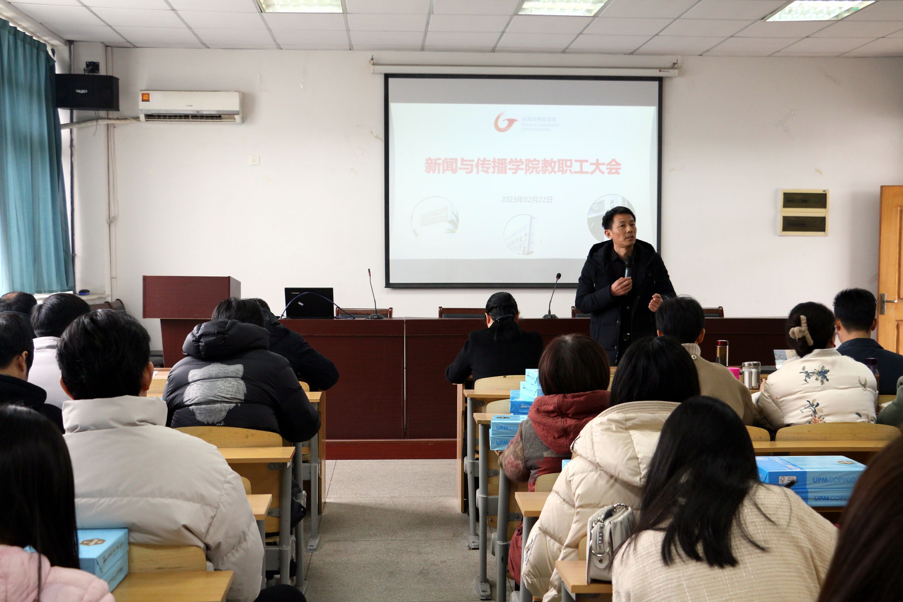 张师帅肯定了2022年学院工作取得的成绩并表达了对全院教师的感谢。他指出2023年,学院要坚持已习近平新时代中国特色社会主义思想为指导,深化改革、内涵发展,围绕“十四五”规划目标,坚持高质量发展的总体要求,以立德树人为根本,以学生发展为中心,以“双一流”建设为牵引,全面推进了“文化领院、内涵融合、转型升级、人才强院”战略,积极推进“两个振兴行动计划”。坚持以马克思主义新闻观为统领,围绕部校共建“三年行动计划”建设方案,结合巡察整改,在制度制定与执行、学科振兴与发展、人才培养机制与创新等方面下功夫,为建设一流新闻学院,培养卓越新闻传播人才而努力。