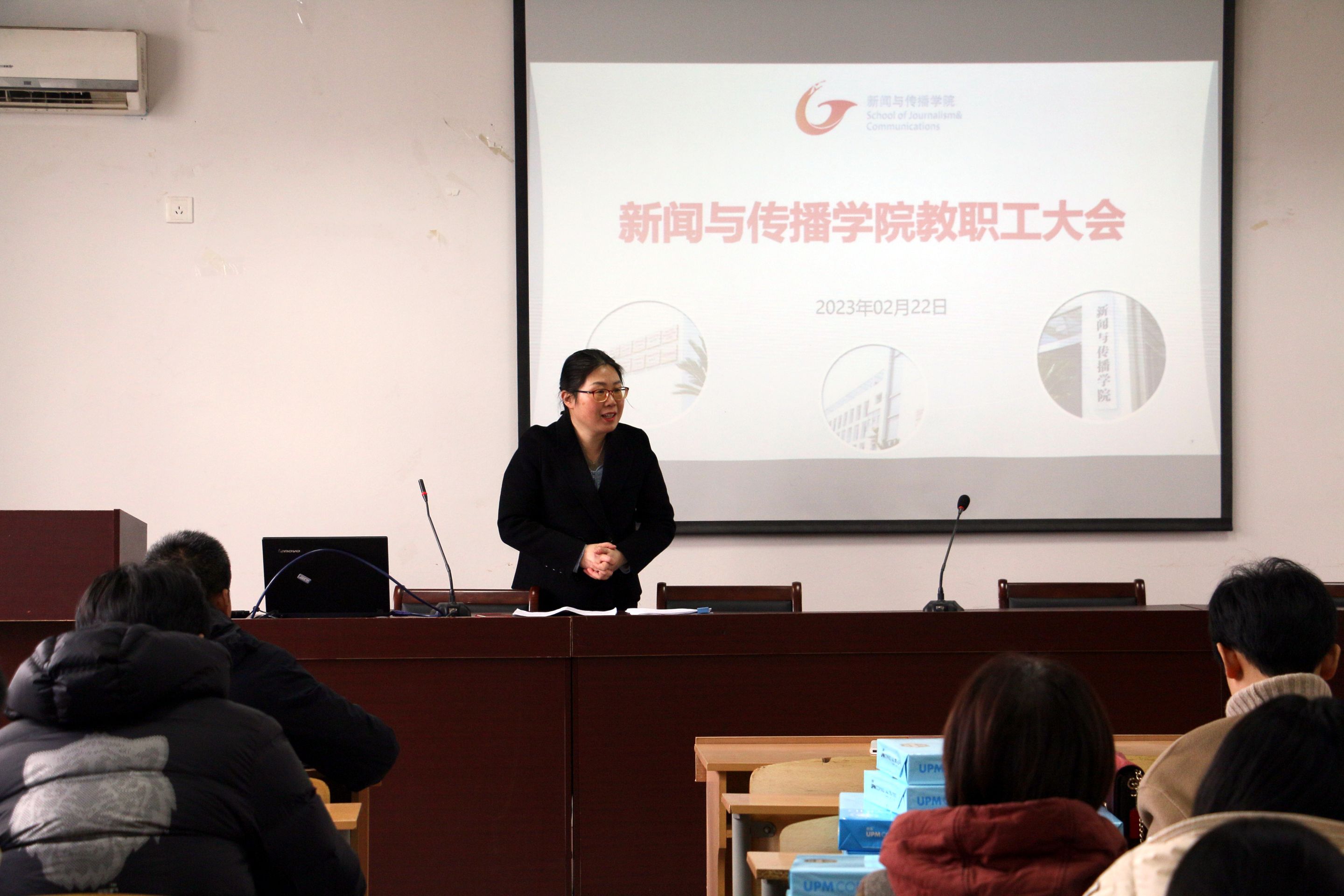 会上,马梅表示,2022年在疫情的影响下,全体教职工同舟共济,砥砺前行,通过线上线下相结合的方式,圆满的完成了各项工作任务。回顾过去,展望未来,她从为何出发,到如何走来,细数了学院成立的十三年历程与部校共建新闻学院的十年征程。尤其是部校共建的成果丰硕,省委有关领导在近期视察时,也给予了充分肯定并对下一个十年的发展寄予殷切期望。她指出,过去的一年,在党建引领之下,院班子始终贯彻“一岗双责”的要求,以党风廉政专题会为抓手,通过多次理论学习,不断增强主体责任意识,完善制度建设。全院教工支部、学生支部也通过多种多样的形式,深入学习领会党的二十大精神。在师德师风建设方面,她强调全体教工要对标对表,自查自省,并深入学习先进人物事迹,营造良好的师德师风氛围。她就教师教学与研修、科研服务与平台、学生竞赛与实践等方面进行了总结,她指出各块工作均做出了成绩,但也存在思想建设不足,制度执行不够,创新能力欠缺,学科方向不集中,省级平台缺乏、保障力度薄弱等六个方面的问题,她强调接下来全院教职工要进一步提升载体、抓实效,育人先育己,积极参与教学、科研、实践、服务活动。
