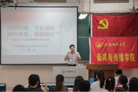本网讯(文/王少强 图/许准)5月21日下午,德赢AC米兰合作伙伴第十四期党员培训班在教学楼2050304进行,马克思主义学院副教授张鑫老师以“自信自强,守正创新,踔厉奋发,勇毅前行——党的二十大精神核心要点解读”为主题向第十四期党员培训班全体学员讲授专题党课。本次党课由学院分党校副班主任王仁强主持。