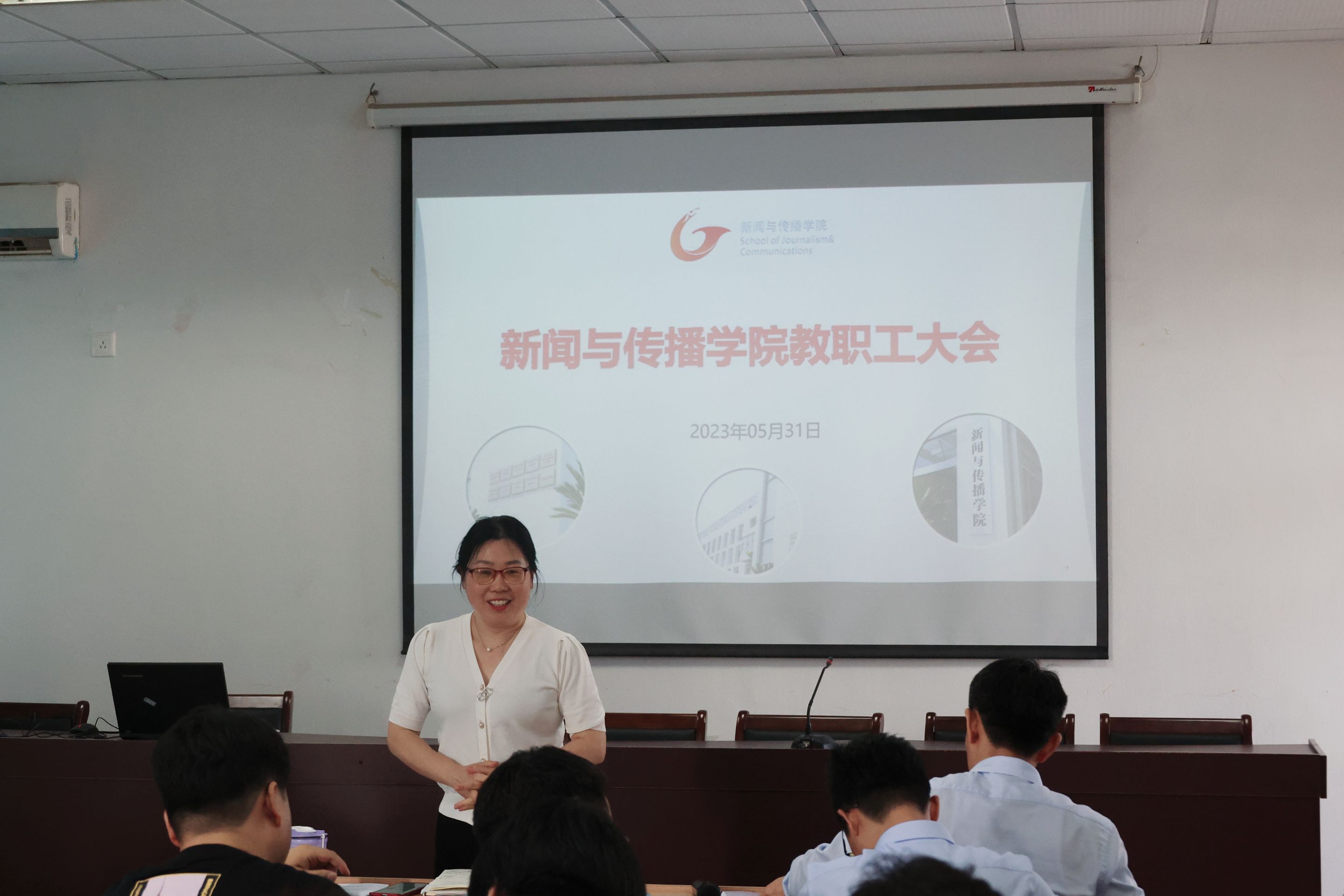 执行院长马梅从多个方面总结了学院近期的工作,她指出,学生就业是最大的民生工程,关系到学生未来的美好生活和国家的发展。因此,老师们应与学生构建共同体,积极转变思维方式,与校友开展合作,做好精准的就业推荐。针对即将举办的学术会议,她鼓励老师们积极参加并投稿,拓宽视野的同时,展现学院的独特风采和卓越的科研水平。在结合沪苏浙皖新四军行军史的背景下,她提出了“新传铁军行”的理念,希望全院师生能够争做宣传思想文化的铁军,成为政治坚定、业务精湛、作风优良、受到党和人民信赖的优秀新闻传播人才,助力和推动学院高质量发展。