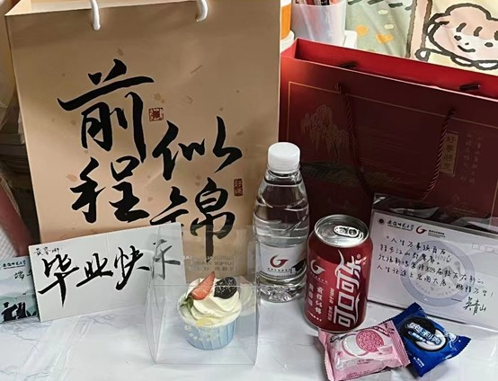 师生共创,备一份诚意满满的毕业礼品。6月19日毕业典礼尾声,当三百多份定制小蛋糕被缓缓推入报告厅,现场响起了此起彼伏的赞叹与掌声。不仅如此,在学院的策划下,学院今年还为每位本科毕业生精心定制了印有新传logo的矿泉水、印有学生姓名的可口可乐、带有全院老师书写的祝福语的班级主题明信片、刻有学生名字的专属印章。学院也为每一位毕业研究生定制保温杯和帆布袋,统一购买行李打包袋方便寄送行李。与此同时,2019级各个班级也发挥各自特色,为同学们准备了带有班级风采的毕业礼物。19级新闻班为每位同学定制了班级专属礼盒,2019级广告班利用班级活动基金为同学们准备了毕业伴手礼盒。