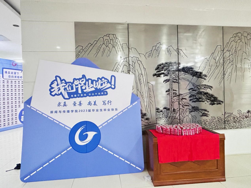 师生合力,办一场与众不同的毕业典礼。6月19日下午,学院2023届毕业典礼暨学位授予仪式在敬文报告厅隆重举行。毕业红毯、纪念门墙、特色签到桁架……精心布置的典礼现场温馨温暖。本次毕业典礼共分为四个篇章,除了有歌曲串烧,校友、家长、老师寄语等传统环节,还增加了具有学院特色的原创诗文朗诵、原创毕业视频、专题纪念视频与对话式表演等师生倾情创设的新颖环节。精心拍摄的采访、拼接了四年荣光的剪辑、承载了四年故事的诗词、包含了青春哲思的对话……在诉诸着离殇的曲调中,每一个创意节目的登场都令现场师生激动欢呼,更感受到本次毕业典礼背后学院师生的用心用情。2019级新闻学专业的刘紫仪是本次毕业典礼的主要负责同学之一,也是一名毕业生。谈及此次毕业典礼的筹备,她感慨到:“前后准备了两周的毕业典礼圆满落幕,老师们、同学们为这次典礼花费了很多心血。广告班同学设计的桁架展板、签到墙、打卡墙受到了大家的一致好评,马星宇老师从北京到安徽的高铁上写的诗歌让同学们泪目,物资组为大家精心准备的定制可乐和矿泉水、明信片、印章、蛋糕、特制礼袋等也让大家很是感动。”2019级网络与新媒体专业的肖欣雨表示:“筹备毕业典礼的老师和各班骨干特别辛苦,在我心里这是一场完美的毕业典礼了,我有个朋友刚好来找我,全程参加了学院毕业典礼的观摩,表示十分羡慕。”