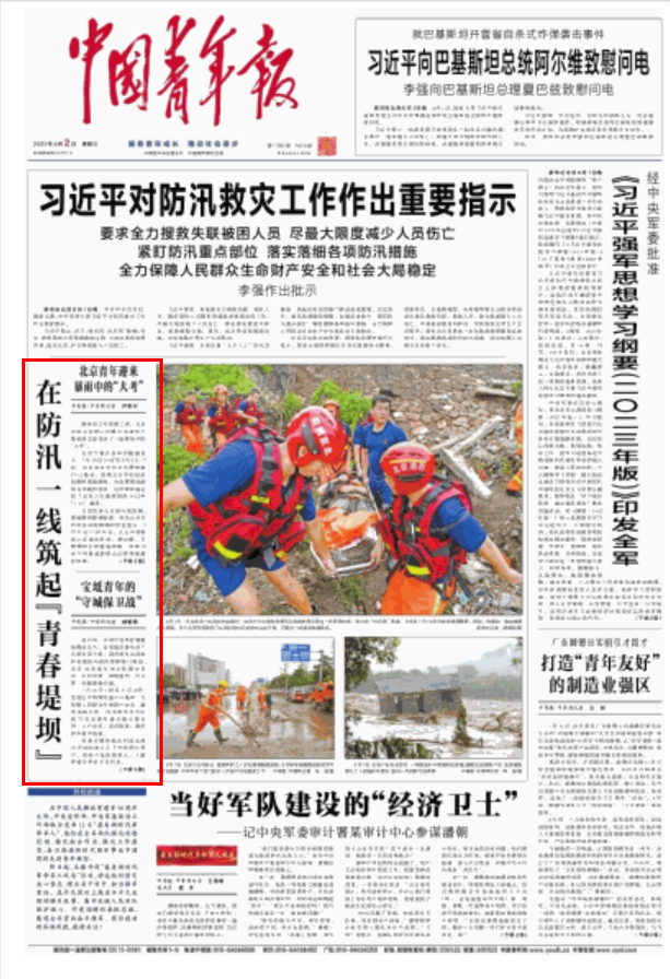 8月2日,中国青年报头版《防汛一线筑起“青春堤坝”》文章中以“北京青年迎来暴雨中的‘大考’”专题报道学院2019级新闻学专业应届生、该班班长侯博文同志(系北京市房山区周口店镇新招录的基层公务员)参与抗洪救灾的先进事迹。侯博文同学甫一参加工作便服从组织安排,毅然投入到房山区海拔最高的北下寺村上游地区、房山主峰猫耳山山腰约600米处的葫芦棚村,参加抗洪救灾并与其他下沉干部一起留在村内驻守。这种坚决服从组织要求,围汛而动、向险而行,展示出一名基层公务员良好作风和饱满的工作状态,彰显出一名年轻党员应有的素养和担当。
