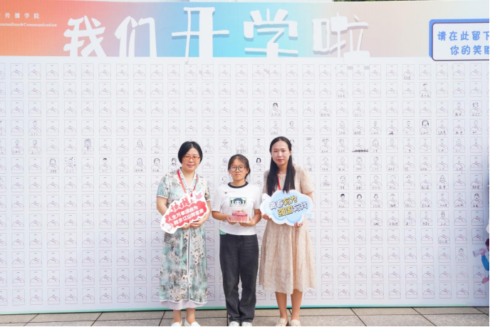 如此种种,无一不在彰显着学院热烈欢迎新生的到来。今年家长可以陪同新生进入校园。新生完成入学报到后,拿上信封前往打卡墙处留下笑脸、戴着校徽与辅导员合影留念。与此同时,学院还安排了摄影人员为新生与主题桁架等为背景拍照,“小萌新”们热情满满地与父母合影,留下了“我来师大(新传)的第一张影像”。