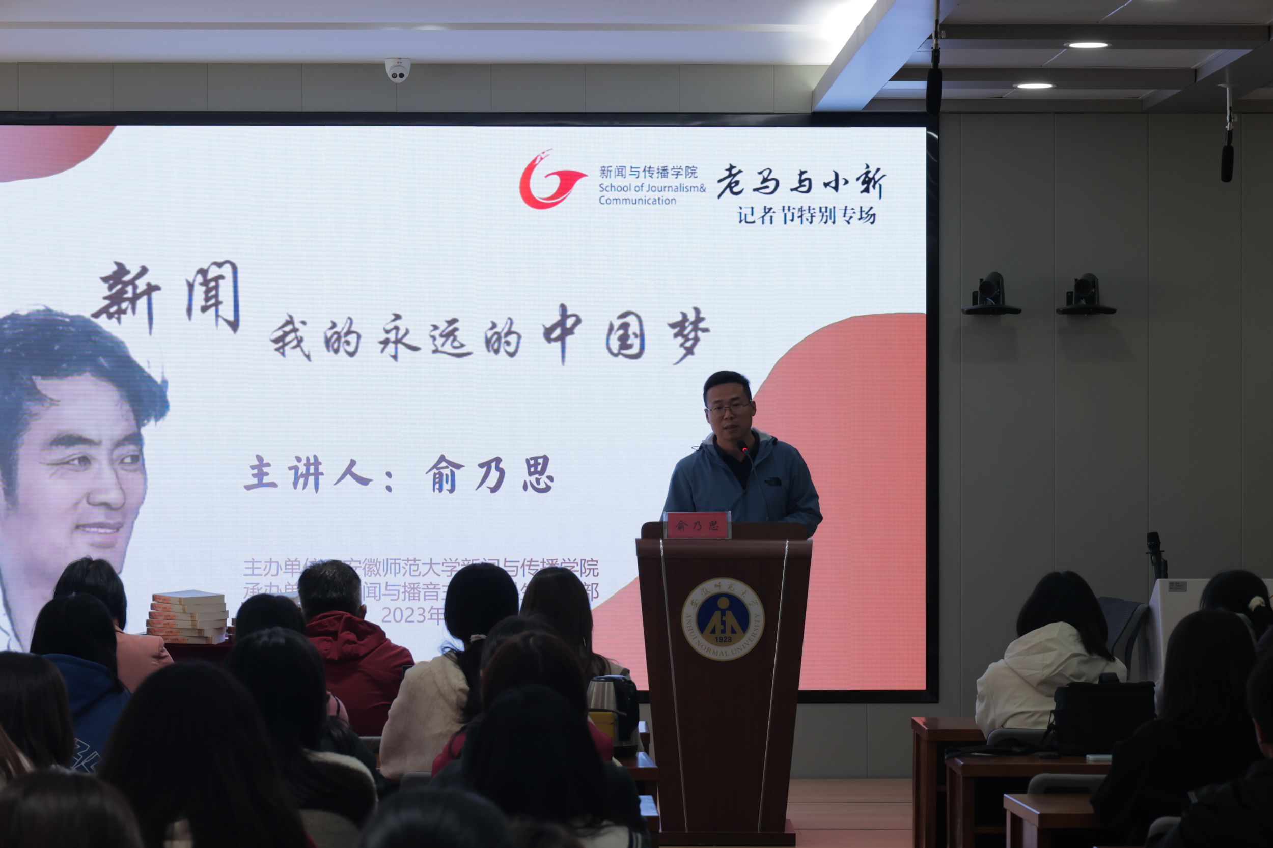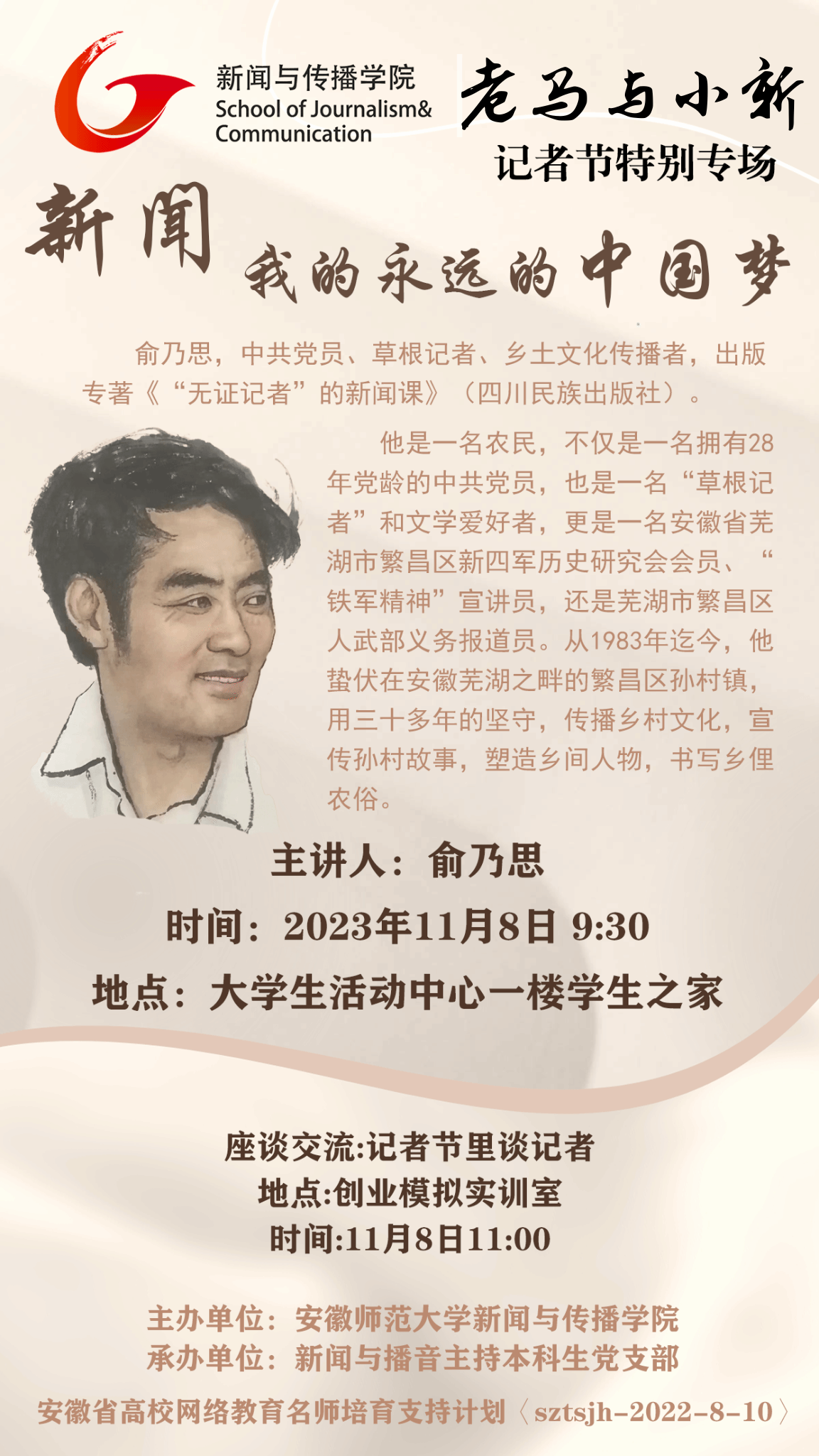 为庆祝第24个记者节,树立大一新生专业认同。11月8日,新闻与播音主持本科生党支部邀请芜湖本土“农民记者”、乡土文化传播者俞乃思老师为2023级新闻学新生作了题为《新闻,我永远的中国梦》的主题讲座。这也是学院马克思主义新闻观品牌活动“老马与小新”的记者节特别专场。学院党委副书记、执行院长马梅参加并做总结讲话;活动由“老马与小新”活动牵头人、安徽省网络名师工作室主持人、辅导员马星宇老师主持。