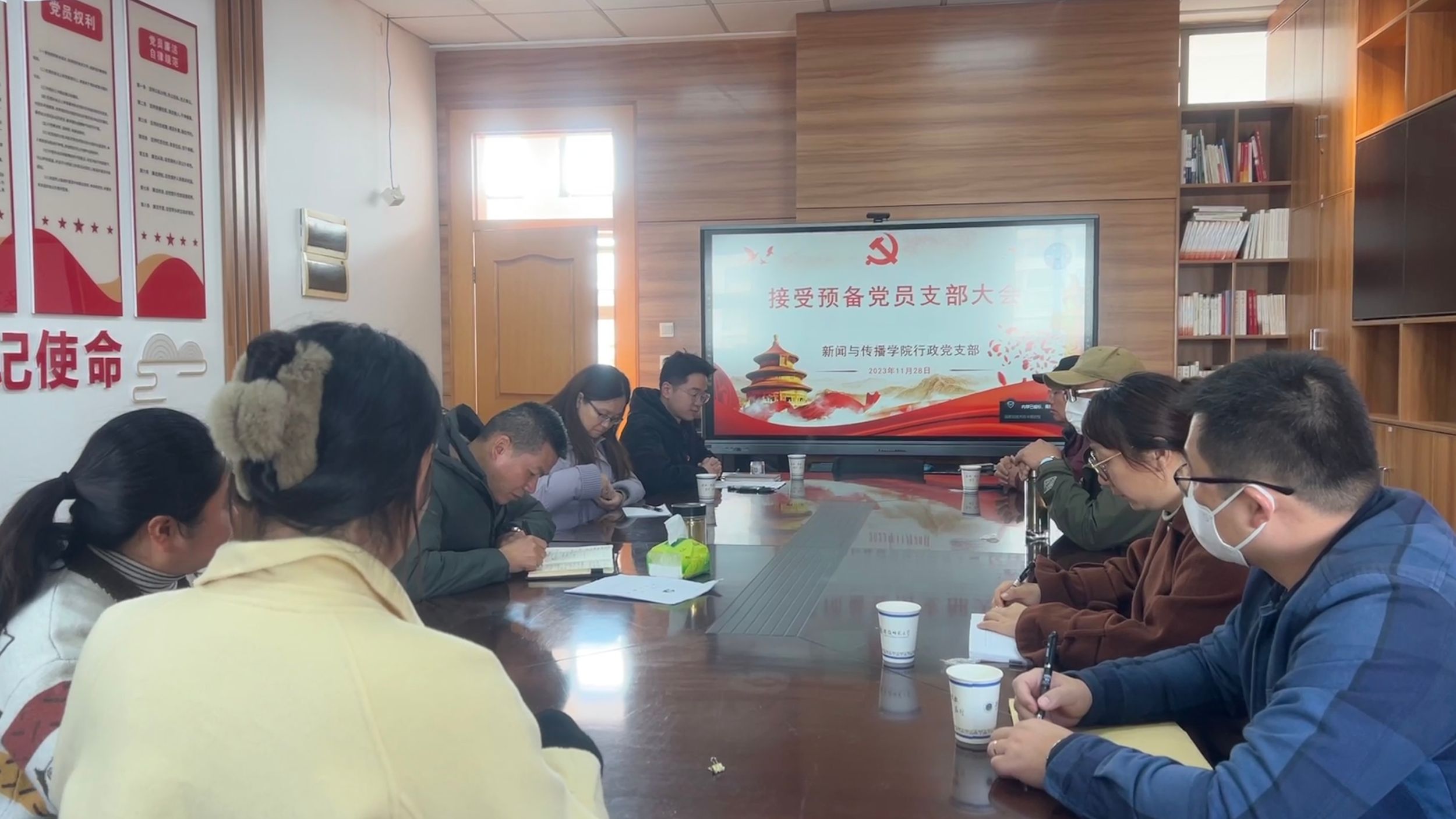 王旭向大会报告了应出席有表决权的正式党员人数与实际到会人数,宣布大会正式开始。发展对象崔霞宣读入党志愿书,并从对党的认识、入党动机、本人履历、家庭和主要社会关系以及需要向党组织说明的问题等方面进行了情况汇报。
