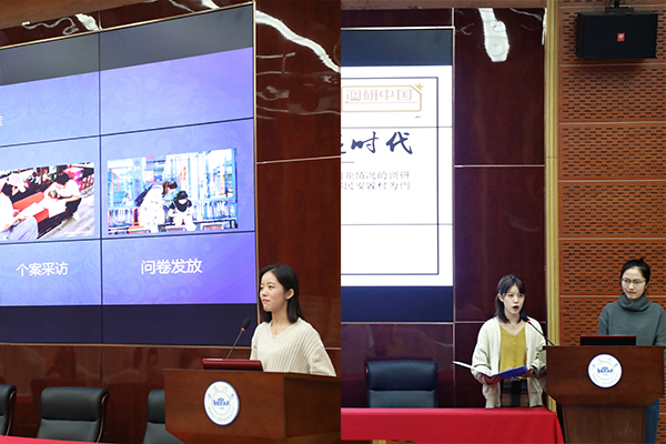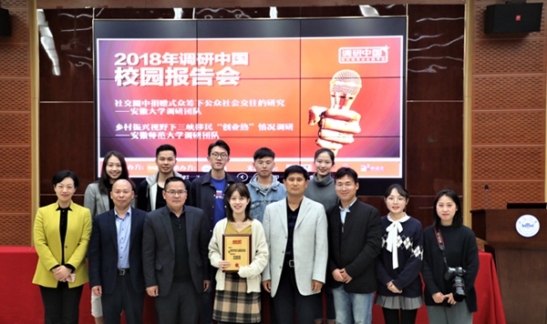 在团队报告环节,安徽大学团队以“社交圈中捐赠式众筹下公众社会交往的研究”为主题进行汇报,成员余跃洪、童碧君、胡子健、方俊丽、徐月霞、程敏分别上台分享实践历程中的点滴收获。我校三峡移民调研团队队长张吴越以“乡村振兴视野下三峡移民创业热情况调研”为主题进行成果汇报,两队都以文字、图片、音视频等多种形式向到场观众再现了实践历程。从头脑风暴到选题敲定;从专业融合到团队协作;从数据分析到群体画像,不一样的是主题,一样的是两校学子用行动践行青春力量的初心。特别是我校团队精心制作的调研主题纪录片、团队剪影视频赢得了现场观众的高度评价和认可。