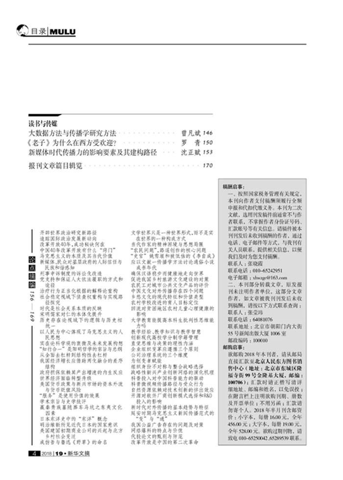 《新媒体时代传播力的影响要素及其构建路径》一文原发于《新闻战线》2018年第7期(上),系国家社会科学基金重大项目“十八大以来中国共产党新闻舆论观研究”(16ZDA215)阶段性研究成果。文章基于传播力重构“何以可能”、如何让传播力的建构路径变得更加清晰可辨、有迹可寻等两大问题,主要对传播力概念进行学理阐释,并探讨了它的时代意蕴。对内容为王、融合为重和用户至上等传播力影响要素进行深刻解读。着重围绕深耕社会重大主题,弘扬主旋律,激发正能量;开辟多元化传播平台,聚焦发力,形成合力;改变传统的宣传和灌输方式,践行精准推送;树立互联网思维,提升用户的忠诚度和依赖度等四个方面,探讨了新媒体时代传播力的建构路径。