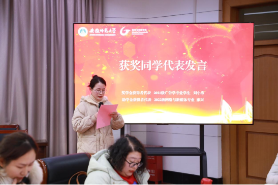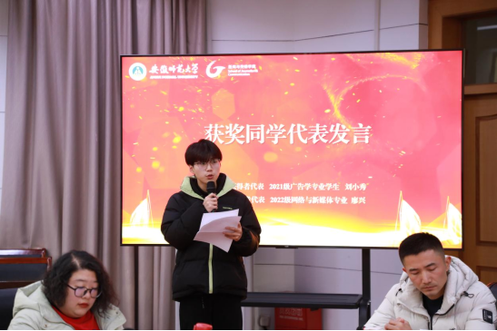 颁发大会上,2021级广告学专业学生刘小秀、2022级网络与新媒体专业学生廖兴分别作为奖学金和助学金获得者代表发言。他们向芜湖市广告协会、捐赠企业和老师汇报了个人的学习与成长,表达了对“芜湖市广协杯”主办方的深深感谢,并表示将继续努力学习、拓展眼界、提升能力、磨练自己。