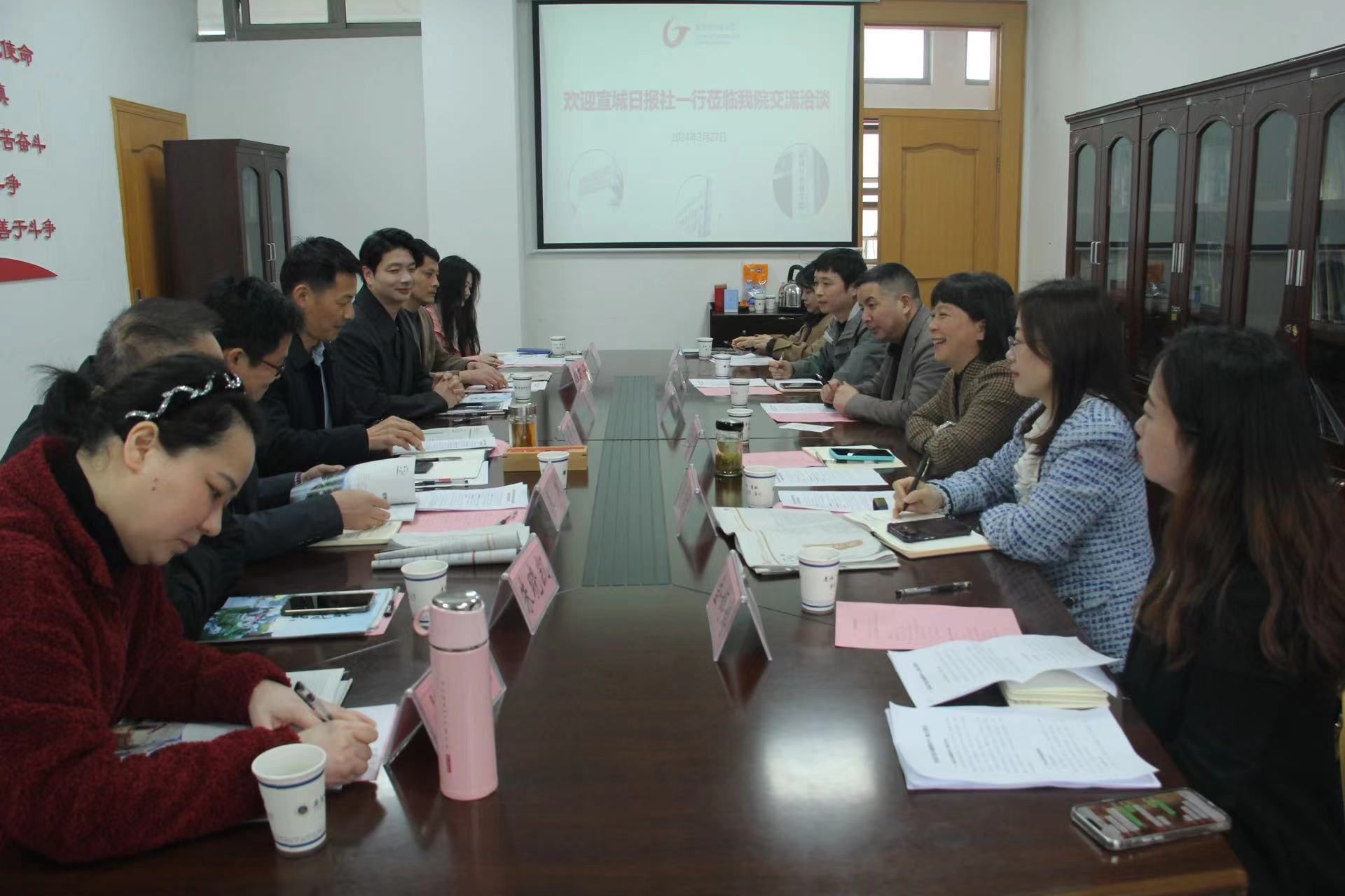 为进一步加强院媒协同,探索校地合作模式。3月27日上午,宣城日报社党组书记、总编辑王建玲、人事财务部主任赵雪梅、发行部主任、办公室副主任吕祥峰等一行6人到访学院进行交流洽谈。学院党委书记张师帅、院学术分委员会副主任朱晓凯、各相关专业主任参加座谈,座谈会由副院长秦枫主持。