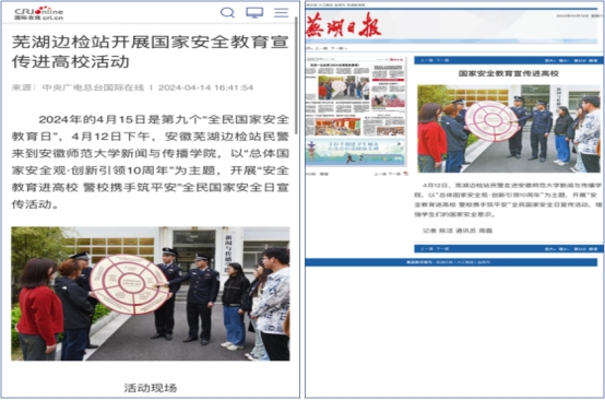 课后,芜湖市出入境边防检查站的民警在同学们当中开展了有奖知识问答活动,同学们热情高涨,纷纷举手抢答。为扩大全民国家安全教育的覆盖面,民警们还来到学院,向师生讲述国家安全常识,引得师生驻足观看,互动交流,事迹被中央广电总台国际在线、芜湖日报、大江看看等国家级、地市级媒体报道。