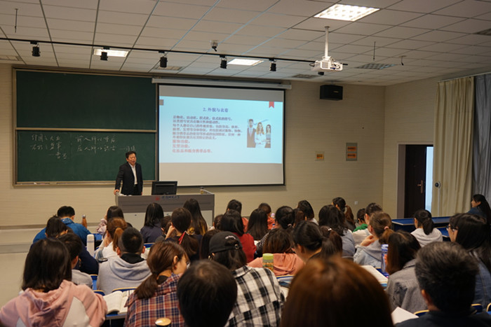 本次示范课程主要讲授“非语言符号系统”。袁立庠教授首先介绍了非语言符号的内涵,并通过引用施拉姆、爱德华·霍尔等人的经典论述展示非语言符号在传播中的作用。接着通过联系实际生活,让同学们尝试用不同的声音和语调去读“我恨你”和“你讨厌”,体验在实践传播中非语言符号表情达意的作用。“面必净,发必理,衣必整,纽必结,头容正,肩容平,胸容宽,背容直。”袁立庠老师引用南开大学创办者张伯苓先生对于老师外貌衣着的要求,向同学们展示了在平时生活中非语言符号的重要性。同时,他结合时事热点,播放两会期间的“红蓝记者”之争视频,作为“非语言符号应用在错误场合”的实例。最后袁立庠老师通过自己在德国、法国、意大利等几个国家使用非语言符号与当地人“无障碍”交流的经验,向同学们展现了非语言符号系统的生活实用性。袁老师激情澎湃的讲授、轻松愉悦的课堂氛围营造、条理清晰的板书,让同学们对教学内容产生巨大的兴趣,也充分展现了他扎实的教学功底、良好的教学素养和较高的教学艺术。