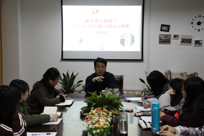胡朝辉由自己的求学经历谈起,讲述自身先前高考面临的挫折,再谈到如今的成功,他说:“没有人的人生是一帆风顺的,没有人能随便成功,在成功之前一定是经历了常人难以想象的挫折!”随后,胡朝辉学长和大家分享了自己在安徽卫视、央视和东方卫视的工作经历,用亲身体验和在座同学强调了奋斗的重要性以及求职工作中需注意的问题。