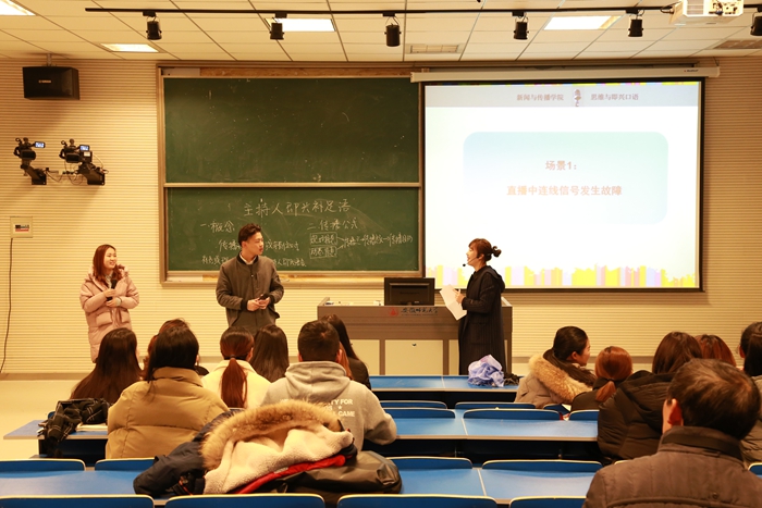 本次课堂教学的内容是 “主持人即兴补足语”。上课伊始,张荻老师便指明,它既是课程的重点也是课程的难点。然后按概念界定、模式分析和情景实训三个步骤展开教学。张荻老师首先阐述了“主持人即兴补足语”的内涵,她以湖南卫视主持人汪涵在《我是歌手》节目中的经典圆场案例为引子,突出了主持人即兴补足语在传播环节中断情况下起到补充和理顺的具体作用,强调了主持人即兴补足语的必要性和重要性。在模式分析环节中,张荻老师又以央视主持人董卿在青歌赛中的现场采访视频为例,分析阐发临场应变主持的价值与意义---既填充了空白时间,又完成了议程串联,还在更大程度上挖掘了传播内涵。张荻老师强调,即兴补足语的关键在于把握和用好现场信息和动态信息,由此概括出所需要的传播点,并按此点明传播意义,呼应传播主题。