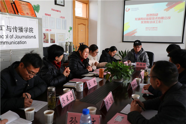 会上, 宋静代表学院向芜湖青丝公司一行到访表示热烈欢迎。她向来宾简要介绍了学校的基本情况,着重介绍了部校共建以来学院的基本状况,表示期待双方围绕就业、实习基地项目展开深度交流合作。马梅分专业详细介绍了学院人才培养的基本状况和毕业生实习、就业方向,她表示,各专业就业都在向“媒介化”方向转变,学院与公司有着广泛的合作前景。