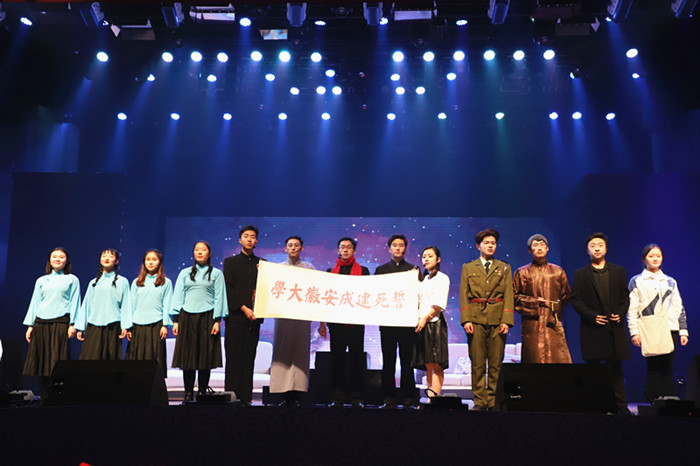 “此日漫挥天下泪,有公足壮海军威!”朗诵剧《甲午》致敬国魂锻造血肉之躯,烽火铸就民族精神。潜岳苍苍,江淮汤汤。莘莘多士,跻玆上庠。一代又一代的师大人,谱写出一部高教兴皖的辉煌历史。在建校九十周年来临之际,原创校庆献礼剧《建校?初心》诉说着新一代师大人依然固守在这赭山之麓、花津河畔,承接着下一个九十年的光辉篇章。歌曲《不忘初心》用歌声唱响新时代,徜徉新未来。难忘峥嵘岁月,革命烈士用鲜血浇灌出花开的国度。芳华永在情仍续,佳时勿忘永相随。师生共同走过的2017,所有温情相伴都锁入光阴的盒子。由全体专业主任和辅导员老师们共同演唱的一首《想把我唱给你听》将晚会的气氛推入高潮,每一句歌词都倾入了全体教师对新生和新年的美好祝福和期望。