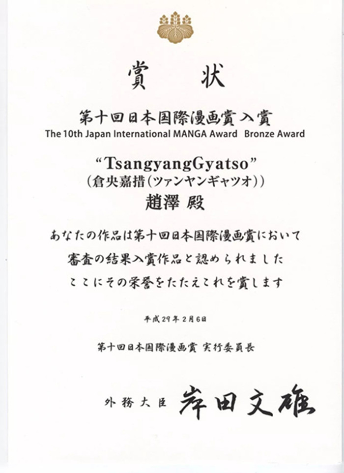 在法国出版两卷,登上法国杂志头版头条,三次赴法在巴黎、里昂等八个城市十几个书店环法巡回签绘售书,参加法国安古兰,圣马洛,BDBOUM三大漫画节,安古兰漫画节第三天售罄……即使是对《仓央嘉措》丝毫不知内容的读者,听此殊荣也会忍不住对赵泽和他的作品好奇不已。《仓央嘉措》是国内漫画中少有的以西藏题材为主题的漫画,它根据六世达赖喇嘛的民间传说和脍炙人口的藏族诗歌改编,以全新的角度讲述了第六代达赖喇嘛仓央嘉措和藏族少女玛吉阿米的爱情故事,用精湛恢弘的画作带领读者领略一代浪漫主义诗人的传奇风采。