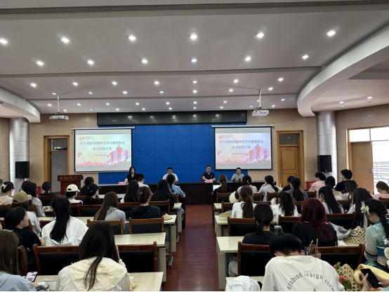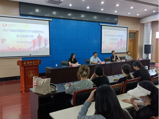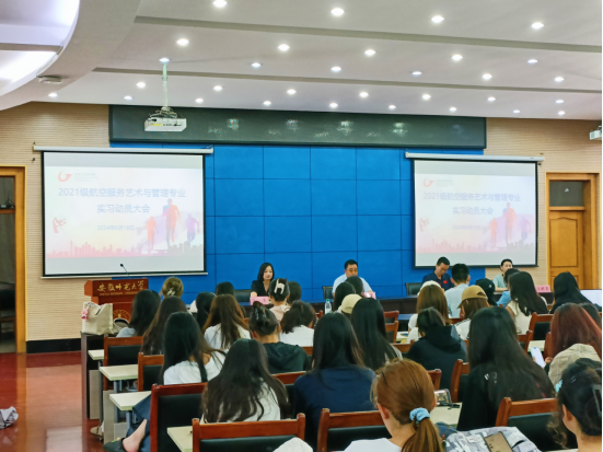 6月18日下午,2021级航空服务艺术与管理专业实习动员大会在花津校区圆形报告厅召开。学院党委副书记吴青山、副院长赵昊,北京广慧金通教育科技有限公司在校负责人疏展、企方辅导员俞应芬,2021级航服专业辅导员张雁、刘熠出席会议,2021级航服专业全体同学参会,会议由航服专业主任冯明荣主持。