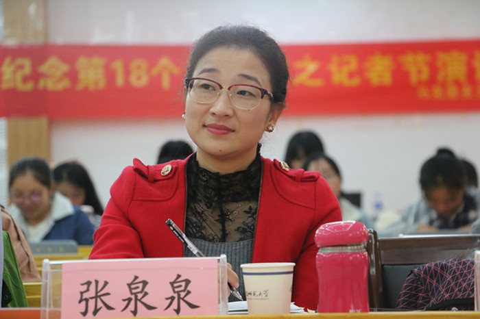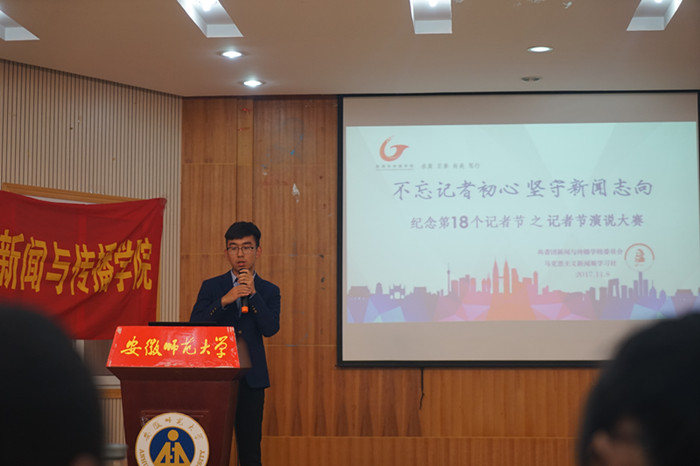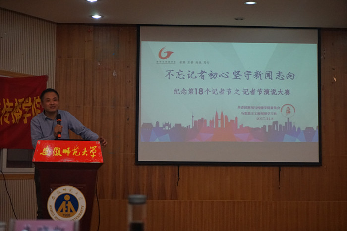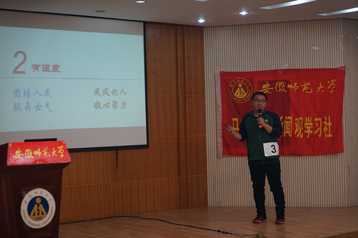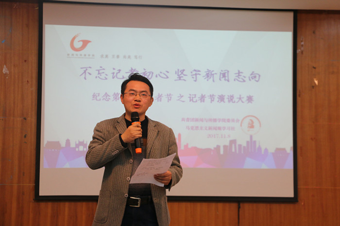 “记者是时代的记录者,是历史的最初撰稿人,是信息的采集者和传播者”。恰逢秋冬相交之际,我们迎来了中国第18个记者节,在这样一个意义非凡的节日里,马克思主义新闻观学习社主办了“开眼看世界,深度思新闻”记者节演说大赛,经过前期的层层遴选,15位来自不同学院的选手突出重围,并于11月8日下午三点在大学生活动中心三楼就业报告厅参加决赛,讲述他们的时政思想和新闻看法。德赢AC米兰合作伙伴院长杨柏岭、院党委副书记宋静、教学副院长马梅、新闻学专业主任肖叶飞、新闻专业教师朱晓凯、张泉泉、王友群,院团委副书记孙月婷、马星宇,以及学院各年级专兼职辅导员莅临指导;同时,校社联副主席、各部门部长以及各兄弟团代表也受邀观看本次比赛。