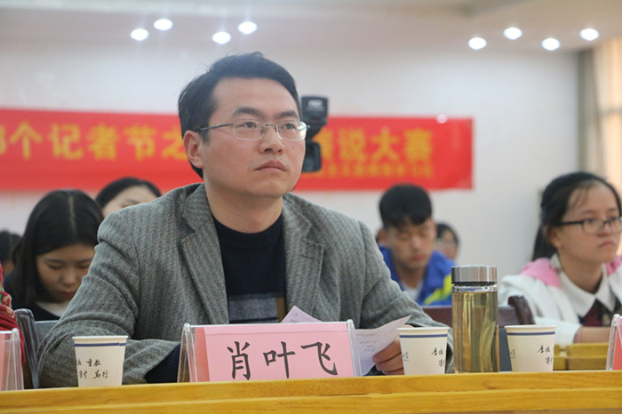 随后,新闻专业主任肖叶飞进行了赛后总结致辞。他首先表示对本次比赛演讲跨专业、多主题的肯定,来自新闻、播音与主持、法律、财务管理等专业的选手用各方各面的信息符号,填满“记者”一词的色彩。其中,有对当下自媒体时代的深刻反思、有对从事未来新闻事业的期望、有对新闻记者在舆论中的角色的深入探索……随后,肖叶飞浅谈各选手的舞台表现,对其普通话、语言流畅度、仪表仪容等方面提出建议,并引用16新闻卢佳欣的演讲词作结:“在这个后真相的时代,我们要拒绝无事实的口水,无真相的情绪,无理性的表态,无证据的怀疑,无厘头的阴谋,无来源地脑补,让看戏的、演戏的、编戏的、加戏的收起他们的神通。”