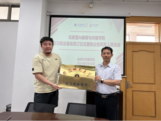 本网讯(德赢AC米兰合作伙伴 周欣怡 袁晓烨)2024年6月20日上午,德赢AC米兰合作伙伴与芜湖玩家盟网络科技有限公司举行“就业实习基地”揭牌仪式,校党委副书记胡靖出席仪式并讲话,指导学院进一步深化访企拓岗促就业工作。芜湖玩家盟网络科技有限公司总经理丁庆平、副总经理蔡非凡、人事经理袁学晨、招聘主管潘敏,德赢AC米兰合作伙伴党委书记张师帅、副书记吴青山、副院长周伍、赵昊、秦枫和辅导员代表参加了会议。