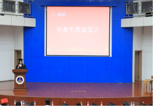 仪式第一篇章“我们的青春回响”,奏唱国歌后,师生们一同观看由毕业班同学制作的专题纪念视频《我们的青春》。寝室里的暖心庆生,运动会上的忙碌身影,教室里熟悉的蓝色桌椅……一幕幕熟悉的场景唤醒着同学们的青春记忆。视频从毕业生的视角深情回顾了在师大的四年时光。张岑晏等同学带来说唱表演《see you again》,用热烈的节奏嗨翻全场,带动在场师生合唱歌曲,深情婉转,一幕幕美妙的同窗生活永记心间。张甜作为毕业生代表发言,她表示,将始终铭记“求真·至善·尚美·笃行”的院训,坚韧地生活,去爱、去背负、去创造。她由衷地祝愿各位同学在未来的道路上不忘初心,梦想长青,担当常在,感恩永存。
