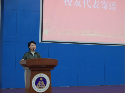 仪式第三篇章“彼此的未来守望”,朱红娟作为校友代表为毕业生们寄语。她回顾与师大的点点滴滴和自己进入社会的工作经历,分享自己的创业成功经验,她说到,“在世界上永远打不过两个字‘热爱’,要敢于做自己,相信自己,追逐内心所想”。随后,吴青山为校友联络员颁发聘书。姜明辉、史哿飞、丁昂杨同学带来配音节目《师大,您要变强大》,内容生动,直戳心窝,鼓掌欢呼声不断。李玥蓉、雍宏岩、王孙貊骊三位同学演唱童年歌谣,轻快的节奏让会场上洋溢着欢乐的氛围,愿各位毕业生依旧能保持住一份纯真、一份朝气、一份热爱。