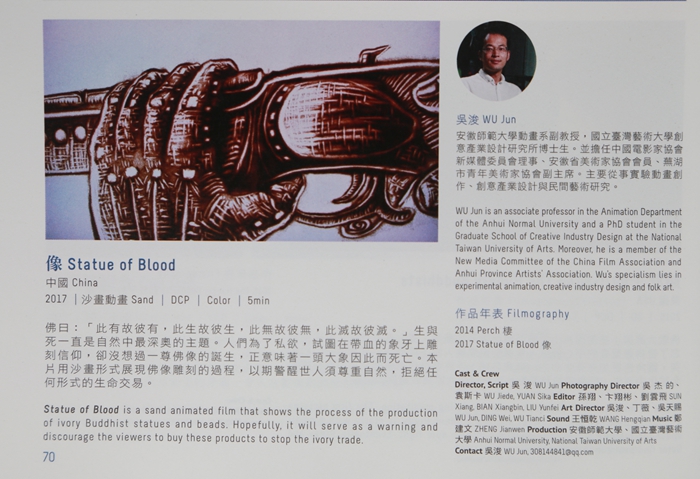 吴浚担任导演的沙动画《像》(Statue of Blood)由,13动画吴天赐、袁斯卡,教师丁薇、吴杰的、孙翔、王恒乾、郑建文(台湾)、卞祥彬、刘云飞老师合作参与,今年年初完成的最新作品。5月,该作品入围2017保加利亚Golden Kuker国际动画节“竞赛单元”;10月,入围第七届StopTrik IFF“国际定格动画单元”(全球仅26件作品,中国2件,另一件为中国美院作品),作品在斯洛文尼亚和波兰两国进行展映。近年吴浚老师带领团队专攻实验动画创作,已为北京、安徽、湖北、云南等多个省市创作沙画宣传片十余部,吴浚导演的上一部沙动画作品《栖》获国际科普微电影大赛最高奖“评委会大奖”等多项国际大奖。