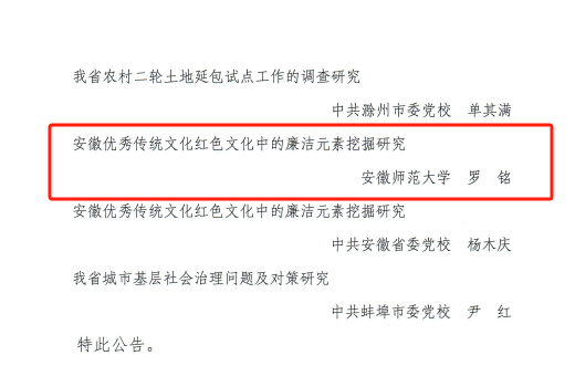 近日,我院纪委委员、广告与网新教师党支部书记罗铭副教授申报的省领导圈定课题《安徽优秀传统文化红色文化中的廉洁元素挖掘研究》成功获批,该项目将从文化传播视角,系统梳理我省优秀传统文化和红色文化中的廉洁元素,围绕如何走好廉洁文化“两创”实践之路,如何在新时代传承和创新安徽廉洁文化等开展系列研究。收集好、整理好、编辑好、讲述好安徽廉洁文化故事,让优秀传统文化说话,让红色革命精神说话,推动我省廉洁文化建设。