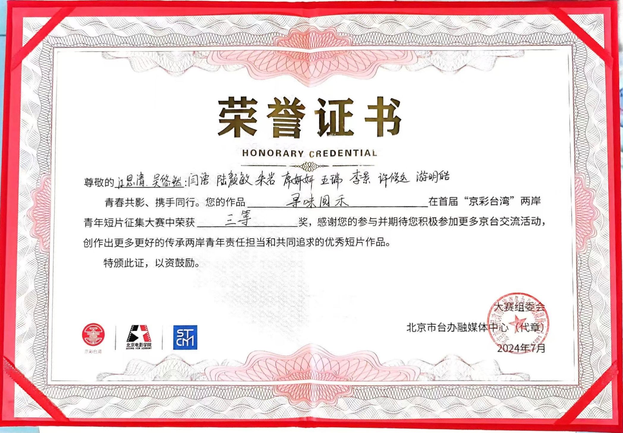 我院教师李子璇指导学生廖兴、王贝贝、纪舒翔、陈涛、陈颖柔、张恒、胡雨婷创作作品《窑滚人生》荣获首届“京彩台湾”两岸青年短片征集大赛最佳人气奖,指导学生江思清、吴悠然、闫语、陆颜敏、朱岩、席妍妍、王瑞、李景、许修远、游明皓创作作品《寻味阅禾》荣获首届“京彩台湾”两岸青年短片征集大赛三等奖。