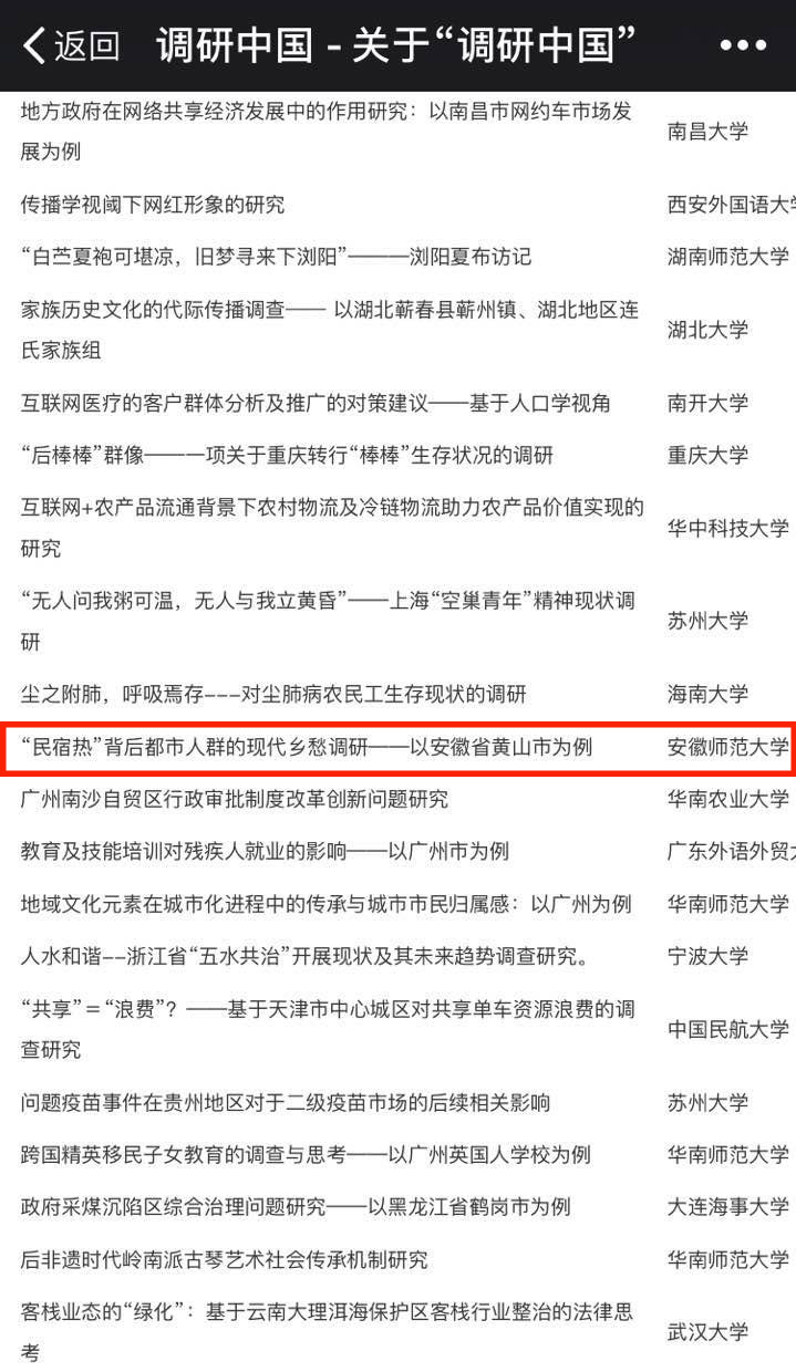 “调研中国”是由南风窗杂志社于2005年发起和组织的,以鼓励和资助中国在校大学生进行社会实践和社会调查的公益活动。活动旨在为关注当下中国社会各方面状况并有兴趣对其进行调查、研究的大学生团队提供必要的资金支持和实操合作,以促进大学生对社会发展现实的深入接触和思考。南风窗杂志社致力通过“调研中国”活动成为大学生社会调查的倡导者和推动者。(文/图 赴皖南专业实践团队)