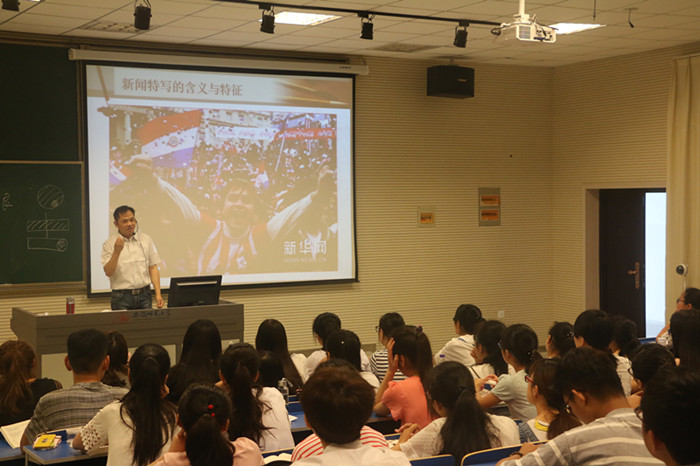朱晓凯在讲解“新闻特写的主要类型”时,以案例为支撑,用幽默通俗的话语对文本进行细致概括与分析。就曾获得中国新闻摄影奖的一张照片,他从画面的构建、清晰度与事件独特性、人物典型性入手,将教学内容与实践理论融会贯通,不断递进写作思路,指出新闻特写的撰写要使人物“立”起来、场景“动”起来、事件如电影般铺展开来。